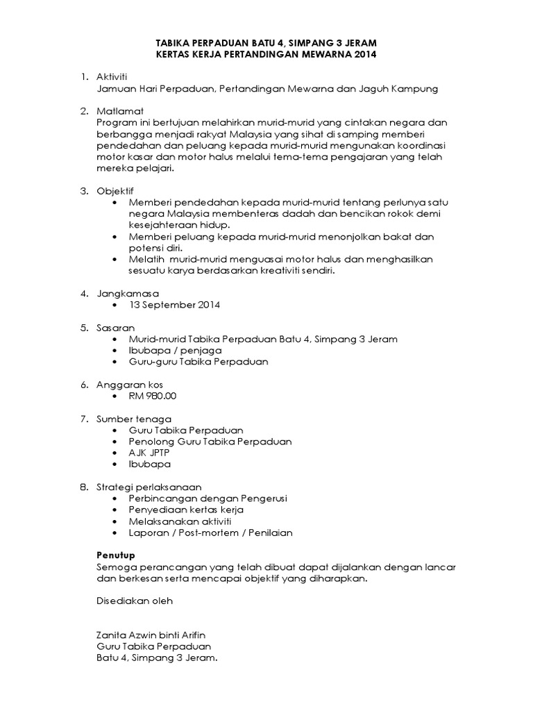 Contoh Kertas Kerja Pertandingan Mewarna Prasekolah